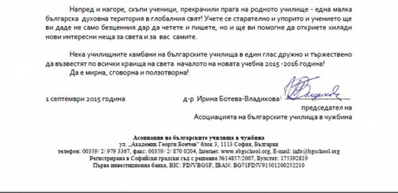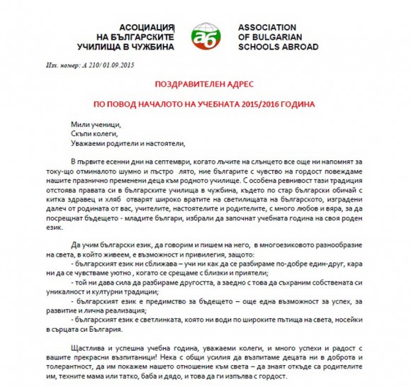 Председателят на Асоциацията на българските училища в чужбина д-р Ирина Ботева-Владикова изпрати поздравителен адрес до българските ученици, техните родители и до своите колеги, българските учители в чужбина. Поздравлението е изпратено във връзка с началото на новата 2015/2016 учебна година. Неговото съдържание може да се види по-долу.