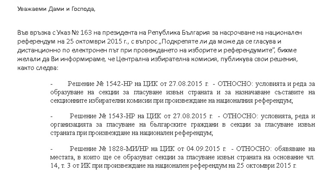 Във връзка с Указ № 163 на президента на Република България за насрочване на национален референдум на 25 октомври 2015 г., с въпрос „Подкрепяте ли да може да се гласува и дистанционно по електронен път при провеждането на изборите и референдумите”, бихме желали да Ви информираме, че Централна избирателна комисия публикува свои решения, както следва: