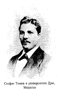Стефан Томов е роден през 1850 г. в Котел, където добива началното си образование. Продължава го последователно в английския колеж „Сейнт Джулиън“ на остров Малта и в Цариград – Робърт колеж. Известно време, по препоръка на Петко Славейков, учителства в Ямбол. Но през 1874 г. е вече в Америка, а от началото на следващата – студент в Богословския университет ДРЮ (DREW) в Медисън, Ню Джърси. От септември 1877 г. до декември 1878 г. работи като проповедник в методистка църква в Гилбертон, Пенсилвания, след което се връща в родината. Доктор по богословие, Стефан Томов е пастор в различни градове на страната, до своята кончина през 1939 г. в София.