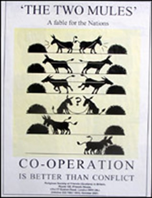 The Two Mules above were taken from Wikipedia to illustrate herein a modification of Buridan’s ass named after the French philosopher Jean Buridan (c. 1295 – 1363). The mules tied with a rope are placed precisely midway between two stacks of hay – the same in size and quality. Further, the Tale clearly demonstrates that cooperation is better than conflict. When each mule tries alone to reach a stack of hay, the two mules remain hungry, both lose (lose-lose solution). When they sit and ponder together – without anyone imposing their decision upon them – they in tandem reach first one, then another stack of hay and thus feed well. In effect, the two mules earn (win-win solution). This tale reminds Aristotle’s De Caelo (On the Heavens) which describes the hungry and thirsty man who is placed equidistant between food and water, but he cannot decide to eat or drink – and so the man remains hungry and thirsty.