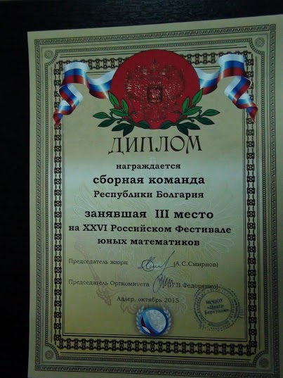 Сборен български отбор успя да достигне почетното трето място на XXVI Руски фестифал на младите математици (Российский фестиваль юных математиков), провел се в Сочи преди дни. Ученици от математическите гимназии в Бургас, София и Пловдив се обединиха и представиха достойно България в оспорвана битка с елита на руската математическа школа.