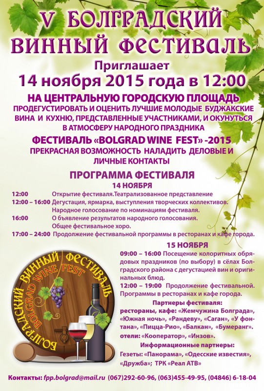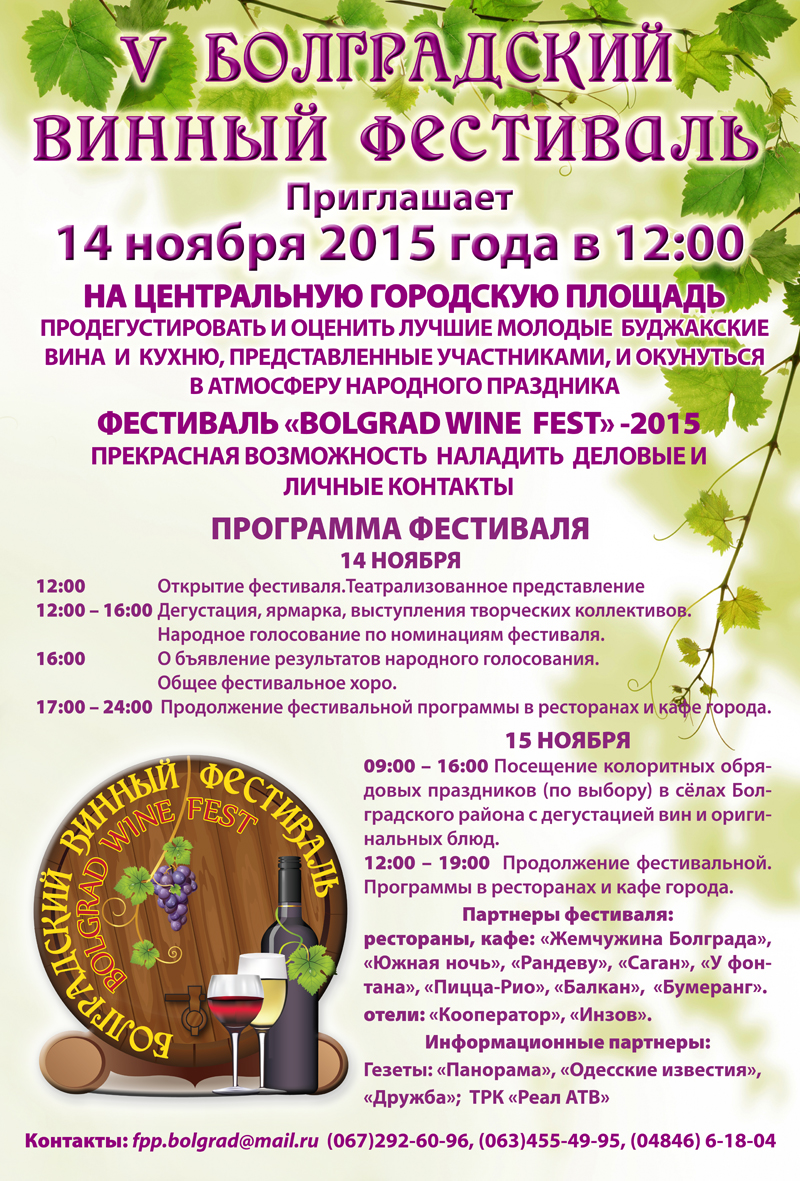 Петият Български ежегоден Винен фестивал кани на 14 ноември 2015 г., от 12 ч. местно време, на централния градски площад в Болград, Одеска област, Украйна.