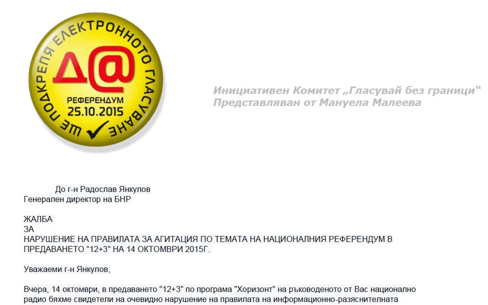 Вчера, 14 октомври, в предаването „12+3“ по програма „Хоризонт“ на ръководеното от Вас национално радио бяхме свидетели на очевидно нарушение на правилата на информационно-разяснителната кампания в обществените медии. Без всякакъв опит за плурализъм на мненията и очевидно преднамерено, в предаването на водещия Петър Волгин беше извършена откровена агитация в полза на едната страна – в случая „НЕ“ – на предстоящия национален референдум на 25 октомври, на който българските избиратели трябва да се произнесат. Мненията и на двамата участници – Юрий Асланов и Калоян Методиев – бяха твърдо на едната страна, както и на самия водещ.