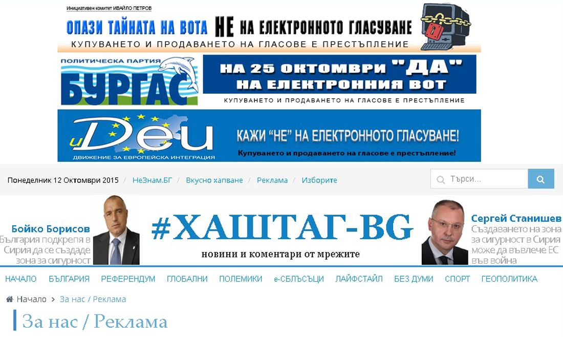 И така, на фона на недостатъчната информационна кампания за референдума в чужбина, където българските поселения са пръснати в най-различни точки на света, се оказа, че за рекламирането на това дали избирателите да отговорят с „да“ или с „не“ на въпроса за възможността за електронно гласуване, няколко партии и инициативни комитети са решили да предоставят своите медийни пакети на доскоро слабо известни медии като например сайта Хаштаг-БГ. За този сайт различни издания писаха, че е свързан с Института за модерна политика /ИПИ/, чийто предишен изпълнителен директор, впрочем, е била сегашната председателка на ЦИК Ивилина Алексиева. Г-жа Алексиева продължава да е в Управителния съвет на ИПИ (вж. тук). Оказва се също така, че според регистрите на ДАКСИ изпълнителната директорка на фондацията, която стои зад сайта Хаштаг-БГ, както и автор в него, Милена Евгениева Борисова, по съпруг Кичашка, е съсобственичка, заедно с основателя на ИПИ и бивш народен представител от НДСВ Борислав Цеков, на фирмата „е-Март Ауторити“. Споменатите фондация и фирма са регистрирани на един и същи адрес в София. Съпругът пък на Милена Кичашка, Петър Кичашки, е в Управителния съвет на Института за модерна политика също, както и кандидат за общински съветник от БСП. По един или друг начин с ИПИ се оказват свързани, според публикация в Clubz.bg, и хора от различни регистрирани в ЦИК партии и инициативни комитети, било с позиция за отговор с „да“ или с „не“ на предстоящия референдум.