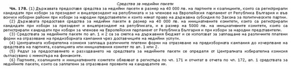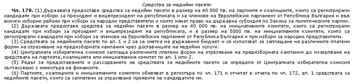 „Чл. 178. (1) Държавата предоставя средства за медийни пакети в размер на 40 000 лв. на партиите и коалициите, които са регистрирали кандидати при избори за президент и вицепрезидент на републиката и за членове на Европейския парламент от Република България и във всички изборни райони при избори за народни представитeли и които нямат право на държавна субсидия по Закона за политическите партии.