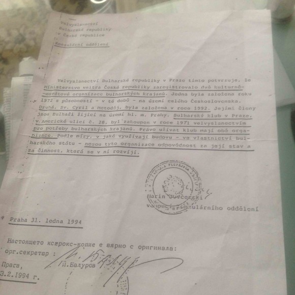 На 31.01.1994 г. посолството на Р. България в Чешката република издава документ, свързан с българските организации в Прага и с Българския клуб на ул. „Америцка“ в чешката столица. С този документ посолството потвърждава, че: „Министерството на Вътрешните работи на Чешката република е регистрирало две културно-просветни организации на българските сънародници. Едната е била основана в 1972 г., през това време с действие по цялата територия на Чехословакия. Втората, „Св. св. Кирил и Методий“, е била основана в 1992 г. Нейните членове са българи, живеещи на територията на столицата гр. Прага. Български клуб /Сграда /Прага на ул. „Америцка“ номер 28 е бил закупен през 1971 г. от Посолството за потребностите на българските сънародници. Право за използване на клуба имат и двете организации, и носят отговорност за нейното състояние /на сградата/, според своята дейност в нея, която е собственост на българската държава.“