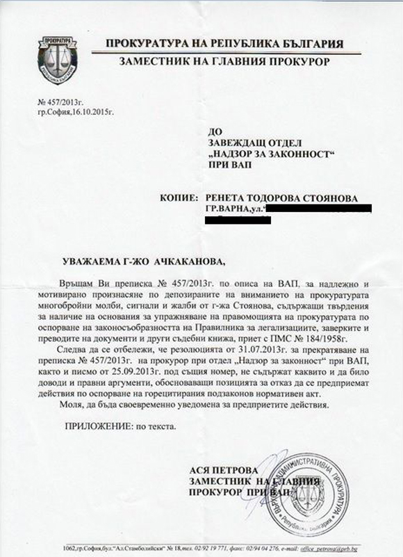 На 20.10.2015 г. получих копие от писмо на зам. главен прокурор Ася Петрова до зав. отдел „Надзор за законност“ при Върховната административна прокуратура /ВАП/. То изисква „надлежно и мотивирано произнасяне“ по оспорване на Правилника за легализациите, заверките и преводите на документи. Зам. главният прокурор пише, че досегашните прокурорски резолюции не са съдържали „каквито и да било доводи и правни аргументи“ за отказ.
