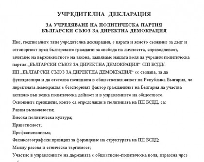 Из Учредителната декларация за създаването на политическа партия БЪЛГАРСКИ СЪЮЗ ЗА ДИРЕКТНА ДЕМОКРАЦИЯ:
