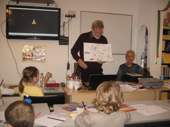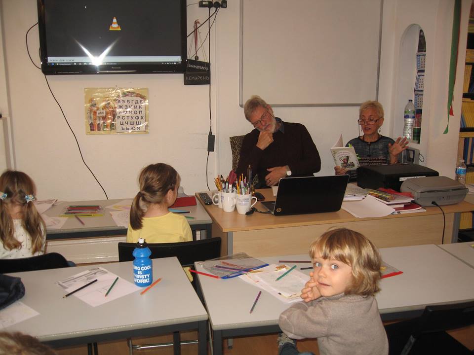 Кристофър Бъкстон представя книгата си пред децата от предучилищните групи. Вдясно от него е съпругата му Анна.