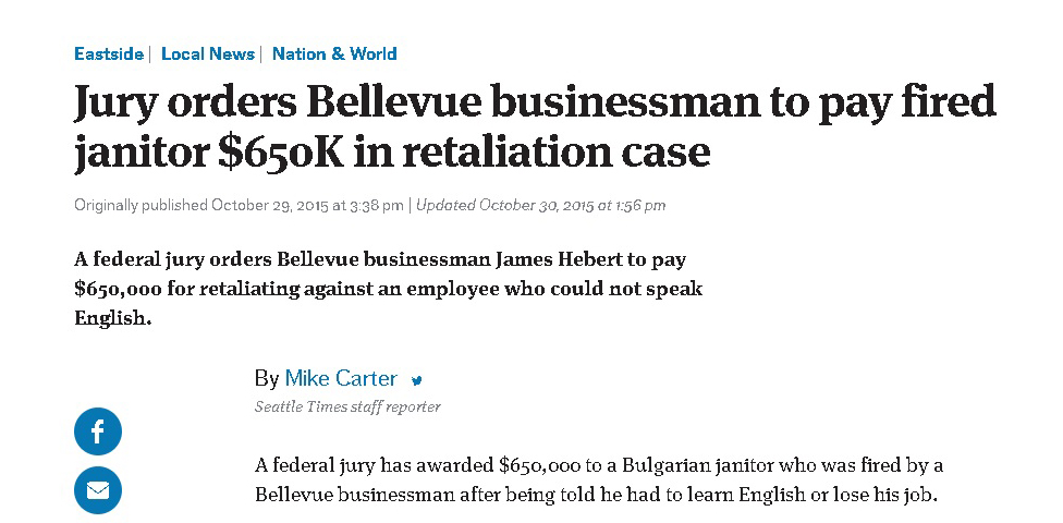 Уволнен българин ще получи 650 хиляди долара обезщетение от американския си работодател, който му заявил, че или трябва да научи английски, или ще загуби работата си – пише Майк Картър във в. „Сиатъл Таймс“.