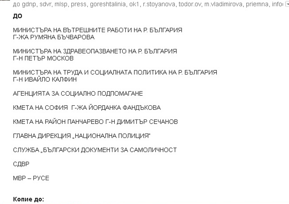 Моля МВР – Русе, което е издало стария зелен паспорт на Ивайло Колев Колев (ЛП серия Л, № 2178025, изд. на 16 май 1984 г. от Окръжно управление на МВР – гр. Русе ) да изпрати на службата „Български документи за самоличност“ към МВР сниман картона, с който му е бил издаден стария зелен паспорт през 1984 г. А след това службата „Български документи за самоличност“ да изпрати същата тази информация на община Панчарево, за да не се притеснява кметът на община Панчарево г-н Сечанов, който впрочем не е местен жител и не познава хората в селото, че Ивайло Колев Колев, който вече едвам ходи и е наистина много болен човек, е някакъв едва ли не терорист. И така да може да бъде дадена в крайна сметка адресна регистрация на Ивайло Колев, след което и лична карта – според както са написали в отговора си на предишен мой сигнал от националната служба „Български документи за самоличност“. Или пък, община Панчарево да попълни по Наредба за ГРАО, която имало за такива случаи, картон с данните за новата адресна регистрация на Ивайло Колев Колев, на която трябва да има негова снимка, и после общината да изпрати този картон на МВР „Български документи за самоличност“.