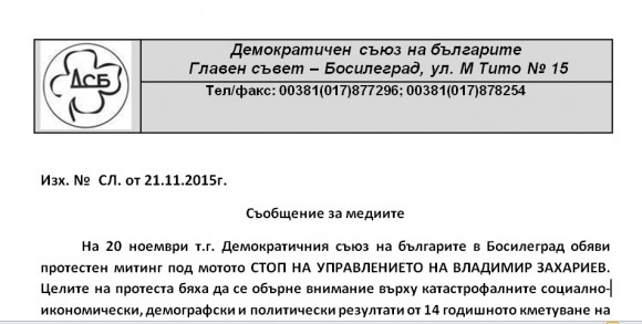 На 20 ноември т.г. Демократичният съюз на българите в Босилеград обяви протестен митинг под мотото „СТОП НА УПРАВЛЕНИЕТО НА ВЛАДИМИР ЗАХАРИЕВ“. Целите на протеста бяха да се обърне внимание върху катастрофалните социално-икономически, демографски и политически резултати от 14 годишното кметуване на Владимир Захариев, застрашаващи живота на населението в общината, както и да се лансира идеята за създаване на широка коалиция от граждани, партии, частни бизнесмени и сдружения, които на предстоящите местни избори през май 2016 г. да предложат нова визия за развитие на общината и да променят местната власт. С тази цел, ДСБ не излезе с партийни знамена, за да покаже, че всички трябва да жертват тяснопартийните си интереси в името на обединението за спасяването на общината.