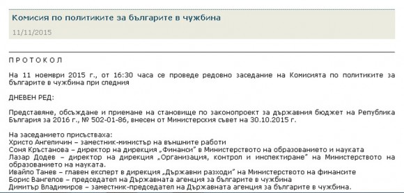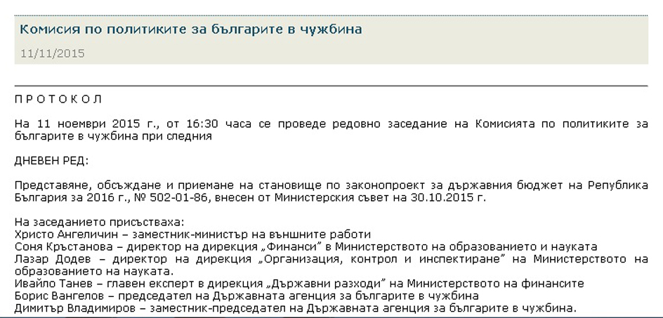 Тази публикация съдържа акценти от изказвания на заседание на Комисията по политиките за българите в чужбина към Народното събрание, проведено на 11 ноември т.г., както и цялата стенограма от това заседание. На него се разисква проектобюджетът на Р. България за следваща година, и по-специално има ли средства и какви, заложени в този бюджет в различни ведомства за политики към българите зад граница. На заседанието, освен членовете на комисията, присъстват зам. външният министър Христо Ангеличин, експерти от Министерство на финансите и от Министерството на образованието и науката, председателят и зам.-председателят на ДАБЧ. Стенограмата е публикувана в сайта на Народното събрание.