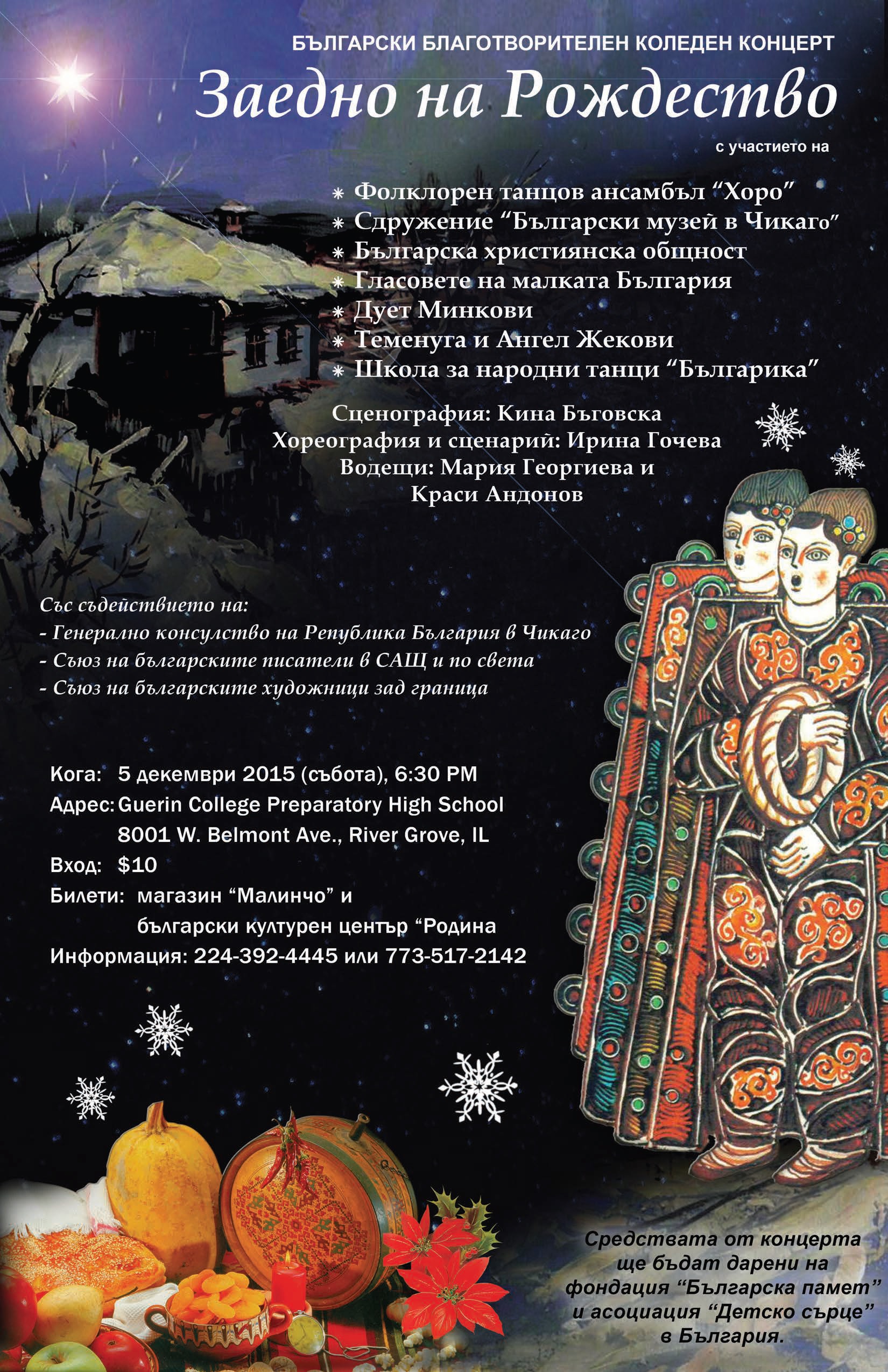 Българската евангелска църква „Нов Живот“ и Българо-американският център за културно наследство, със съдействието на Генералното консулство на Р. България в Чикаго, Съюза на българските писатели в САЩ и по света, и Съюза на българските художници зад граница, организират български благотворителен коледен концерт под надслов „ЗАЕДНО НА РОЖДЕСТВО“.
