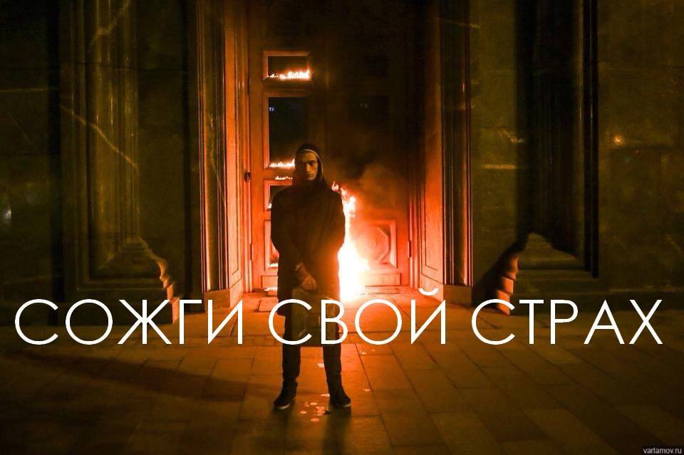 Похожая тема и в его новой акции с поджогом дверей здания ФСБ. Здесь, конечно, очевидна символика: двери Лубянки — это врата ада, вход в мир абсолютного зла. И на фоне адского пламени стоит одинокий художник, ожидая, пока его схватят. Очень сильный художественный образ.