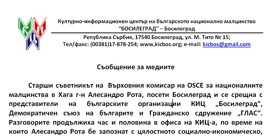 Алесандро Рота, старши съветник на Върховния комисар за националните малцинства в Организацията за сигурност и сътрудничество в Европа /ОССЕ/ посети Босилеград и се срещна с представители на българските организации КИЦ „Босилеград“, Демократичен съюз на българите и Гражданско сдружение „ГЛАС“.