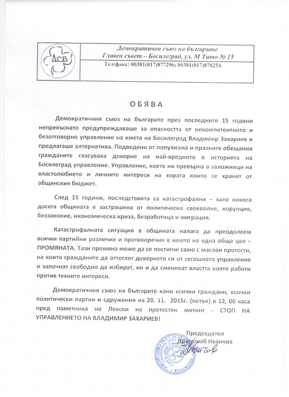 Демократичният съюз на българите в Сърбия, Главен съвет – Босилеград кани гражданите, всички политически партии и сдружения, на протестен митинг против начина на управление на кмета на града Владимир Захариев. Митингът е насрочен за 20 ноември т.г. от 12 часа местно време пред паметника на Васил Левски в Босилеград. В съобщение по този повод, чието съдържание може да се види по-долу, Демократичният съюз на българите обяснява мотивите за този протест.