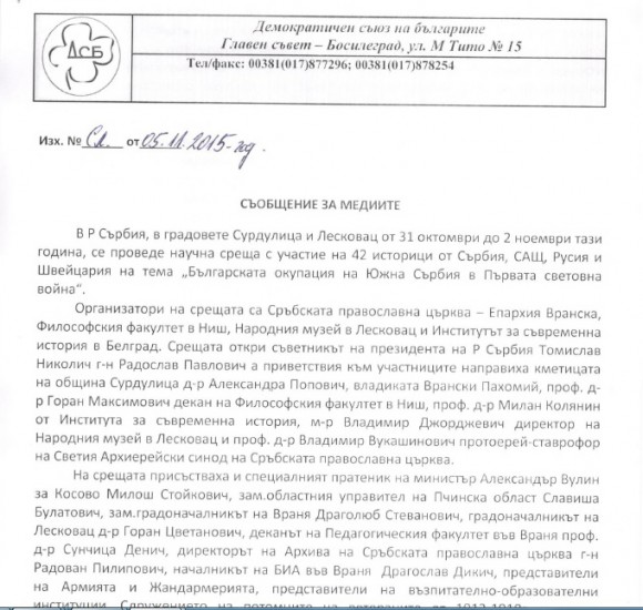 Демократичният съюз на българите, Главен съвет – Босилеград изпрати днес съобщение до медиите, в което изразява своето възмущение от исторически спекулации, изказани на проведена наскоро в Р. Сърбия конференция с участието на историци от различни страни, на тема „Българската окупация на Южна Сърбия в Първата световна война“. В съобщението се казва: