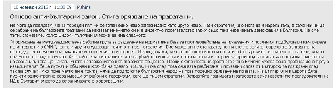 „Формиране на междуведомствена работна група за създаване на нормативна база за противодействие на изказвания и послания, подбуждащи към омраза по интернет и в СМИ“, както и други смущаващи точки в т. нар. стратегия. Вие може би не съзнавате, но ни взехте всичко, обрекохте българите на геноцид, сега вече ще ни наказвате и за мнения по интернет. Искам да кажа, че с антибългарската си политика българските правителства са тези, които най-много насаждат омраза. Ако най-накрая извършителите на убийства и всякакви престъпления и от ромски произход започнат да получават адекватни наказания, това ще намали много напрежението в българското общество. Преди около месец възрастната жена Емилия Бузова беше пребита до смърт, а извършителят беше пуснат и обвинен в кражба на одеяло и 30 лв. Нима след това очаквате разбиране и похвални слова от Българските граждани след такива случаи? Ако поне малко ви е грижа, няма да подложите българския народ на това поредно орязване на правата. И в България и в Европа бяха пуснати безконтролно хора идващи от райони с тероризъм, сега ще пишем стратегии. Затваряйте границата и затворете вече известните последователи на ИД в България вместо да се занимавате с бюрокращини.“