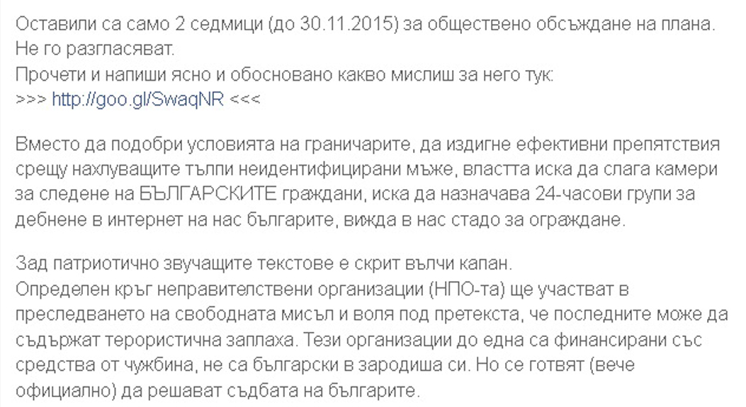 „Вместо да подобри условията на граничарите, да издигне ефективни препятствия срещу нахлуващите тълпи неидентифицирани мъже, властта иска да слага камери за следене на БЪЛГАРСКИТЕ граждани, иска да назначава 24-часови групи за дебнене в интернет на нас, българите, вижда в нас стадо за ограждане.