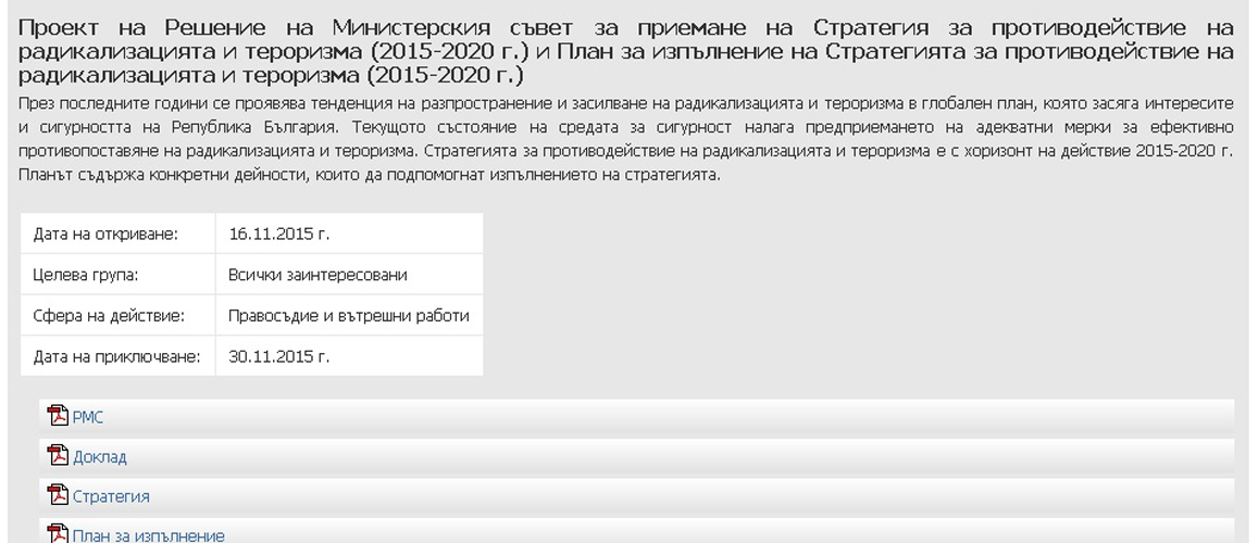Във връзка с Проект за Решение на Министерски съвет на Р. България за приемане на Стратегия за противодействие на радикализацията и тероризма (2015-2020 г.) и План за изпълнение на тази Стратегия, които за пет години напред, но за тяхното обществено обсъждане са били отделени само две седмици, в различни групи във Фейсбук може да се прочетат съобщения, в които се казва: