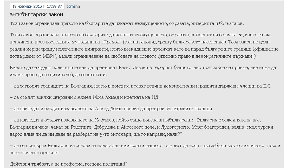 „Този закон ограничава правото на българите да изкажат възмущението, омразата, мизерията и болката си, които са им причинени през последните 25 години на „Преход“ (т.е. на геноцид срещу българското население). Този закон не цели реални мерки срещу нелегалните имигранти, които всекидневно пресичат като на парад българските граници (официално потвърдено от МВР!), а цели ограничаване на свободата на словото (изконно право в демократичните държави!) Вместо да се чудят политиците как да превърнат Васил Левски в терорист (защото, ако този закон се приеме, ние няма да имаме право да го цитираме), да се хванат и: