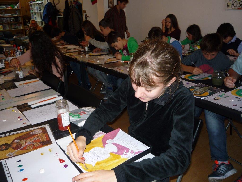 В началото на деня отец Симеон благослови труда на децата и тяхното старание. С бои и четки малките иконописци възвръщаха в съзнанието си спомените за делото на светите Кирил и Методий, Климент Охридски, Борис-Михаил Покръстител, Иван Рилски, Патриарх Евтимий.