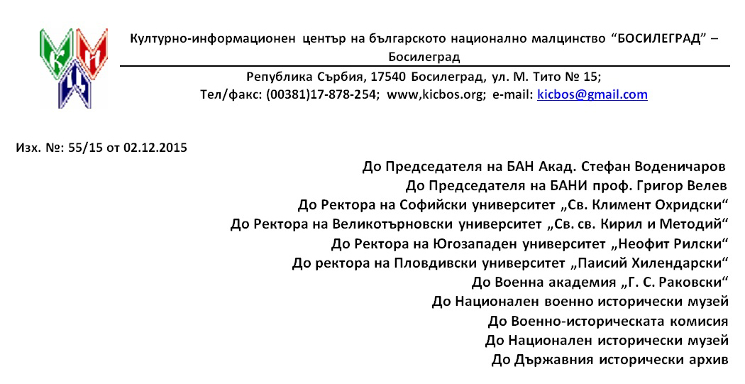 КИЦ „Босилеград“ се обърна с писмо до ръководствата на БАН, БАНИ, Военна академия, Национален исторически музей, Национален военно-исторически музей, Военно-историческата комисия, Държавния архив и ректорите на Софийски, Великотърновски, Югозападен и Пловдивски университети, както и до Светия синод на БПЦ (съдържанието на това писмо може да се види по-долу в публикацията – бел.ред.), с молба да се произнесат по повод твърденията и заключенията на научната среща „Българската окупация на Южна Сърбия 1915 -1918 г.“ за „…терора и престъпленията на българските окупационни сили над свещенството, чиновниците, учителите, видните граждани и останалото население от 1915-1918г.“, както и за твърденията на сръбските историци, че в Сурдулица по време на ПСВ Българската армия била избила от 3 000 до 30 000 сърби и интернирала в България от 150 до 180 000 души.