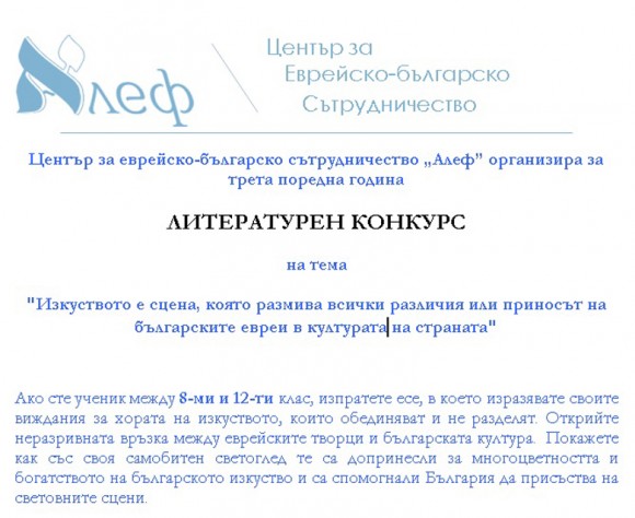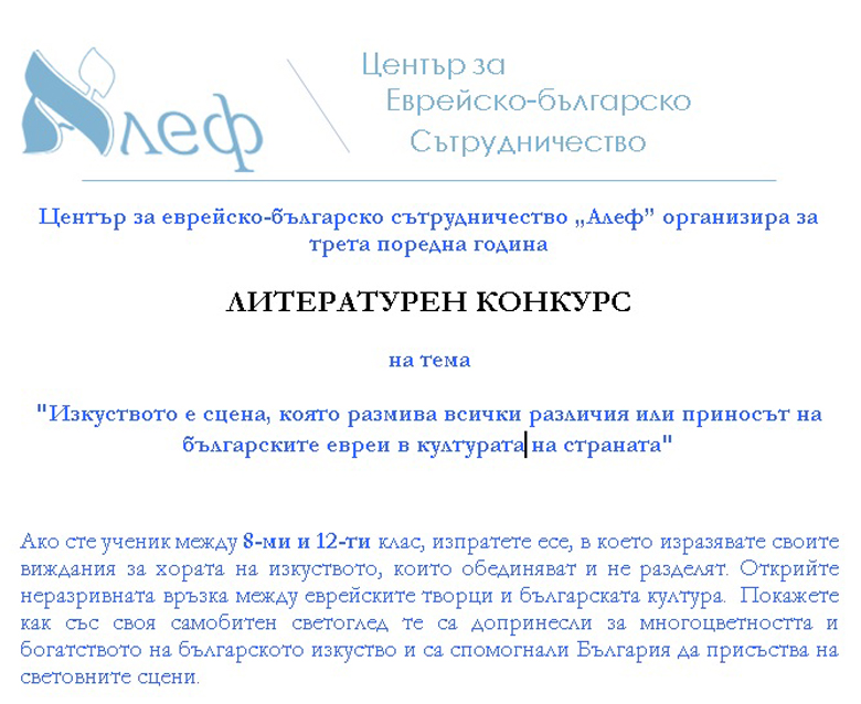 „Изкуството е сцена, която размива всички различия или приносът на българските евреи в културата на страната“ е темата за тазгодишната надпревара в литературния конкурс на Центъра за еврейско-българско сътрудничество „Алеф“.