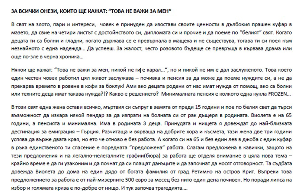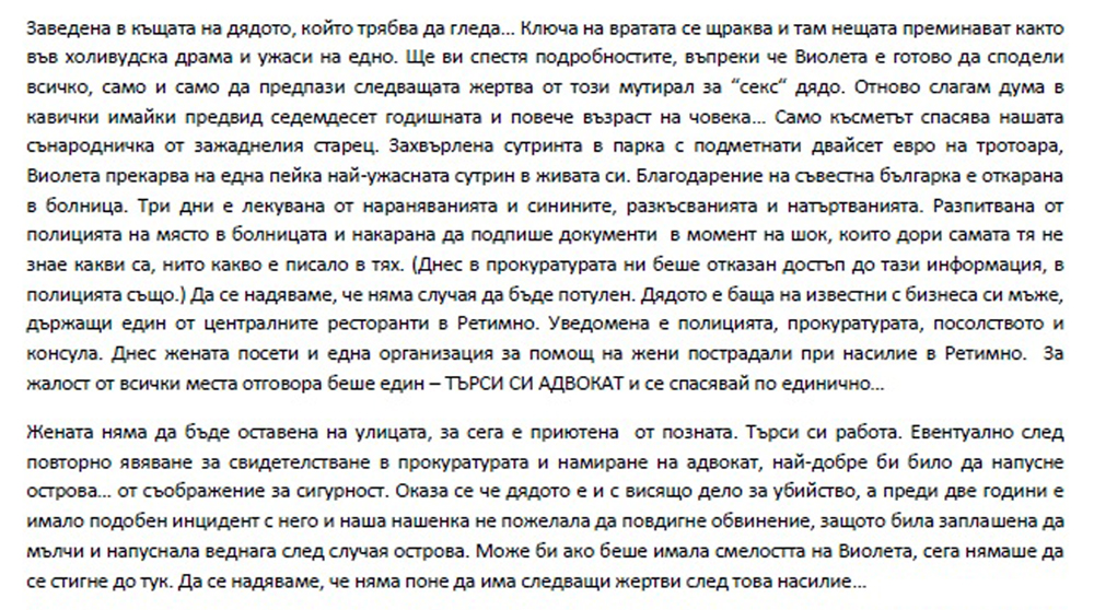 Една българка, подгонена от мизерията, отива в гр. Ретимно на остров Крит да гледа болен дядо, за да помогне на дъщеря си, която е болна от рак, и на внуците си. За съжаление обаче дядото се оказва сексманиак, чийто син е богат и влиятелен бизнесмен. Няма кой да защити тази българка, преживяла гавра и насилие, я тя е твърде бедна да си наеме адвокат… Повече за тази история може да се разбере от видеоматериала по-долу, публикуван вчера в You Tube от Сдружението на българите на остров Крит. Както и в обяснителния текст, написан от член на това сдружение, който следва след видеото.