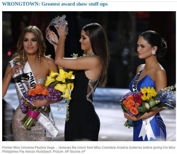 На главата ѝ вече беше поставена короната на победителката, когато водещият Стив Харви започна да се извинява, че неправилно е прочел името в подадения му плик.