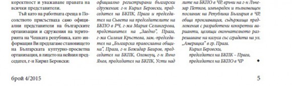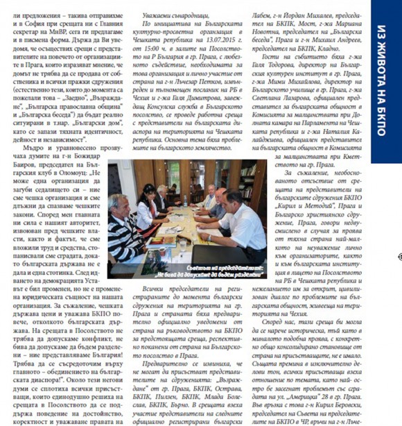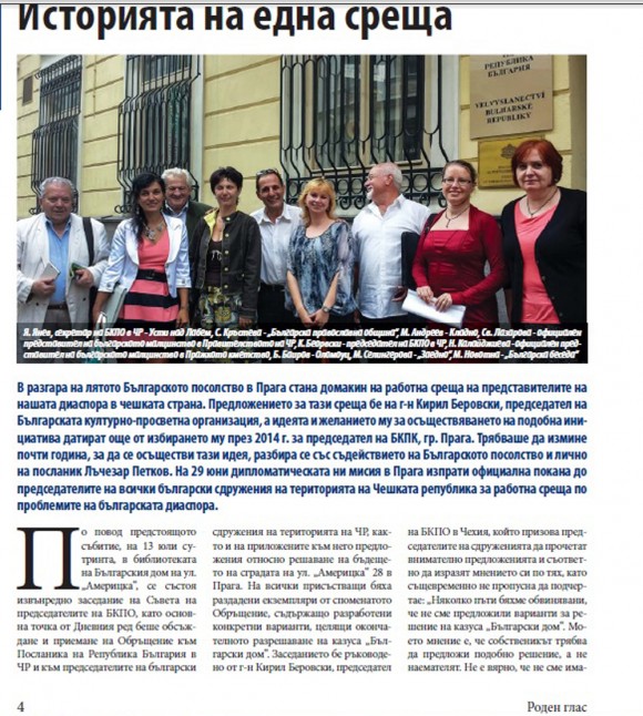 Под заглавие „Историята на една среща“ в. „Роден глас“ публикува в своя бр. 4 от 2015 г. материал за работната среща на българската диаспора в Чехия, проведена в сградата на българското посолство в Прага на 13 юли т.г. По-надолу може да се види препубликация в Еврочикаго на този материал. Както и препубликация на едно обръщение на Кирил Беровски към българите в Чехия от м. октомври т.г., публикувано също във в. „Роден глас“, бр. 5/2015 г. То е написано след като става ясно, че всички опити от страна на БКПО за диалог с Външно министерство и всички усилия за разумно решение на проблема с Българския клуб в Прага не са се увенчали с успех – МВнР не отговаря по никакъв начин – нито писмено, нито по телефона на предложенията на БКПО, а решава да премине към съдебни действия.
