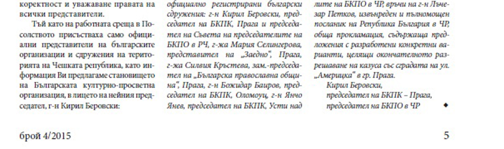 Срещата в посолството от м. юли, за която става дума в първия публикуван във в. „Роден глас“ материал, се провежда по инициатива и след много усилия от страна на Българската-културно просветна организация в Чехия и на нейния председател Кирил Беровски. На тази среща, за която нашето издание информира още преди време, е обсъден проблемът с Българския клуб в Прага и сградата на ул. „Америцка“ 28 в чешката столица. На срещата идват представители на различни местни дружества на БКПО, на други български организации в Чехия. Присъстват и директорът на Българския културен институт в Прага Галя Тодорова, директорът на Българското училище в Прага Мими Михайлова, официалният представител за българската общност в Комисията за малцинствата в Долната камара на чешкия Парламент Светлана Лазарова, официалният представител за българската общност в Комисията за малцинствата при Кметството на гр. Прага Наталия Калайджиева.