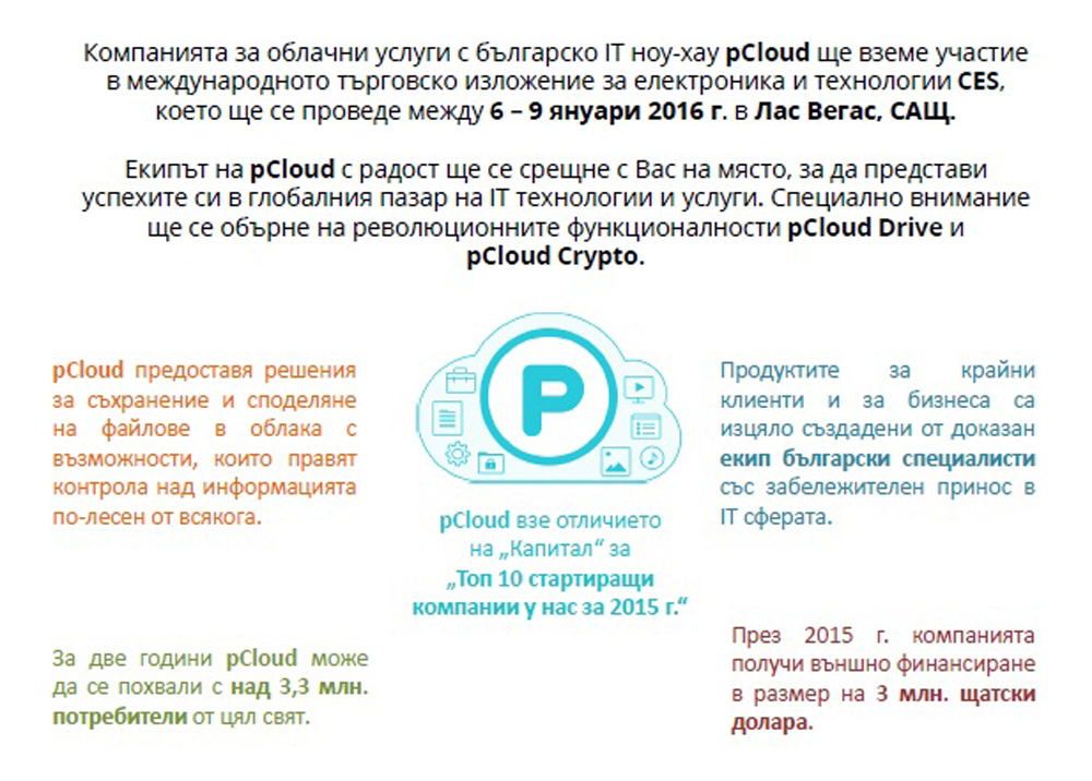 Иновативната компания за облачни услуги с българско IT ноу-хау pCloud ще вземе участие в международното търговско изложение за електроника и технологии CES, което ще се проведе от 6 до 9 януари 2016 г. в Лас Вегас, САЩ.
