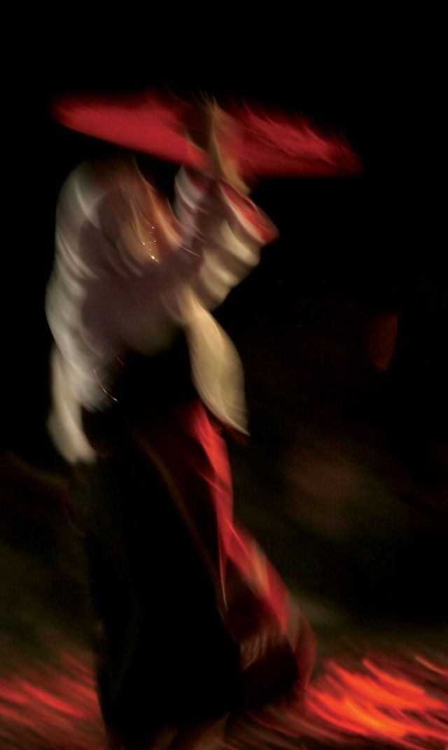 Баба Неда притичваше с боси крака по въглените, държеше иконата в ръце, навеждаше се, изправяше се, учестяваше, забавяше, а нозете й сякаш не докосваха земята. Завиваше рязко, повдигаше ръце нагоре и настрани, полите на сукмана й потрепваха, ръкавите се люлееха… На лицето й бе застинала блага усмивка, очите грееха… Приличаше на младо момиче… Кавалът се изтърколи от пейката на плочника и млъкна.