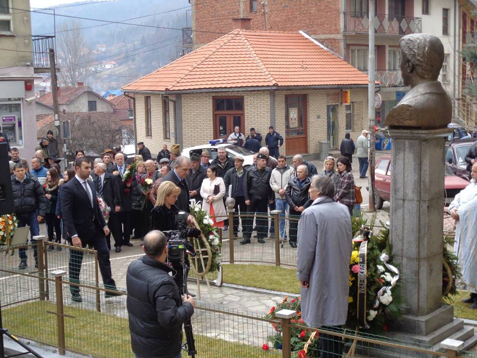Поздравленията и словата за Левски бяха произнесени в салона на КИЦ „Босилеград“, след което всички заедно се отправиха към паметника на Левски. Там се наложи да изчакат да приключи поклонението, организирано от кмета Захариев, което закъсня около половин час, след което гости и домакини се поклониха пред паметника на Левски и положиха венци и цветя.
