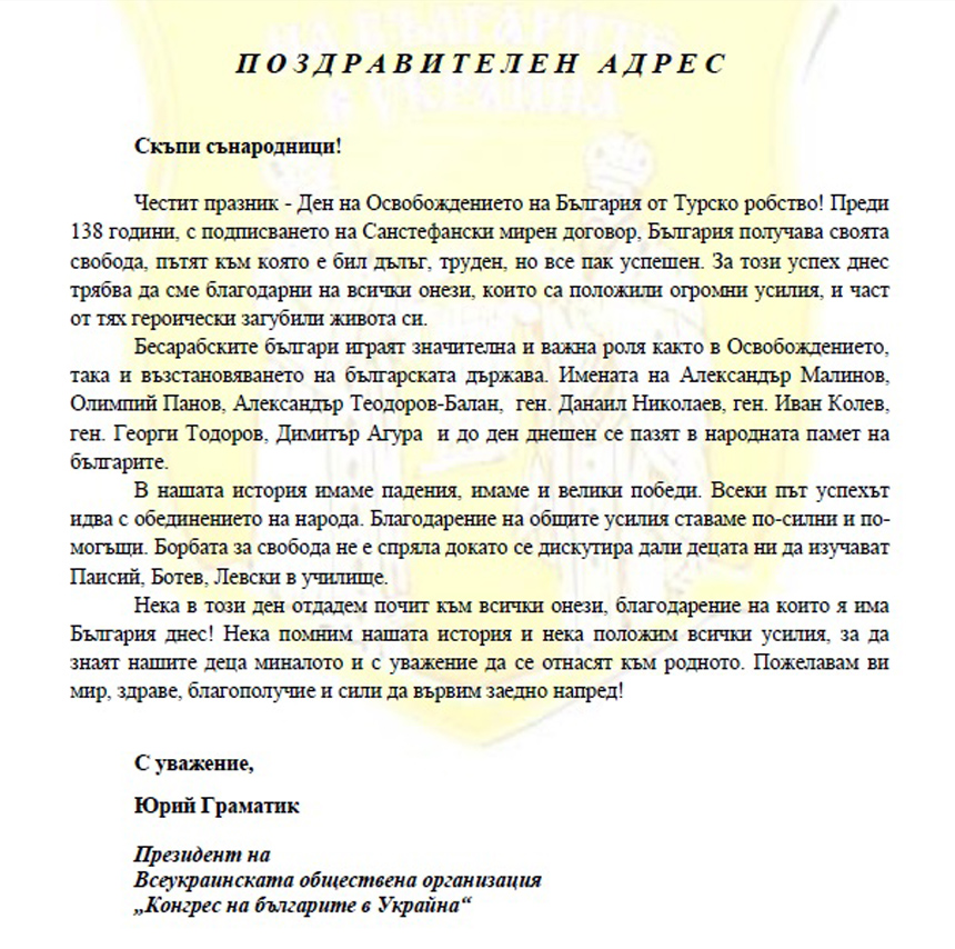 от Всеукраинска обществена организация „Конгрес на българите в Украйна“