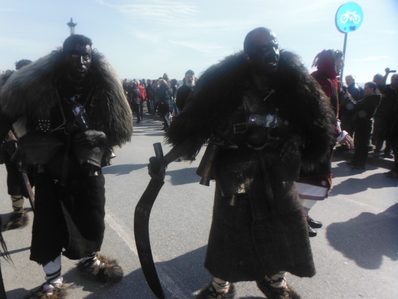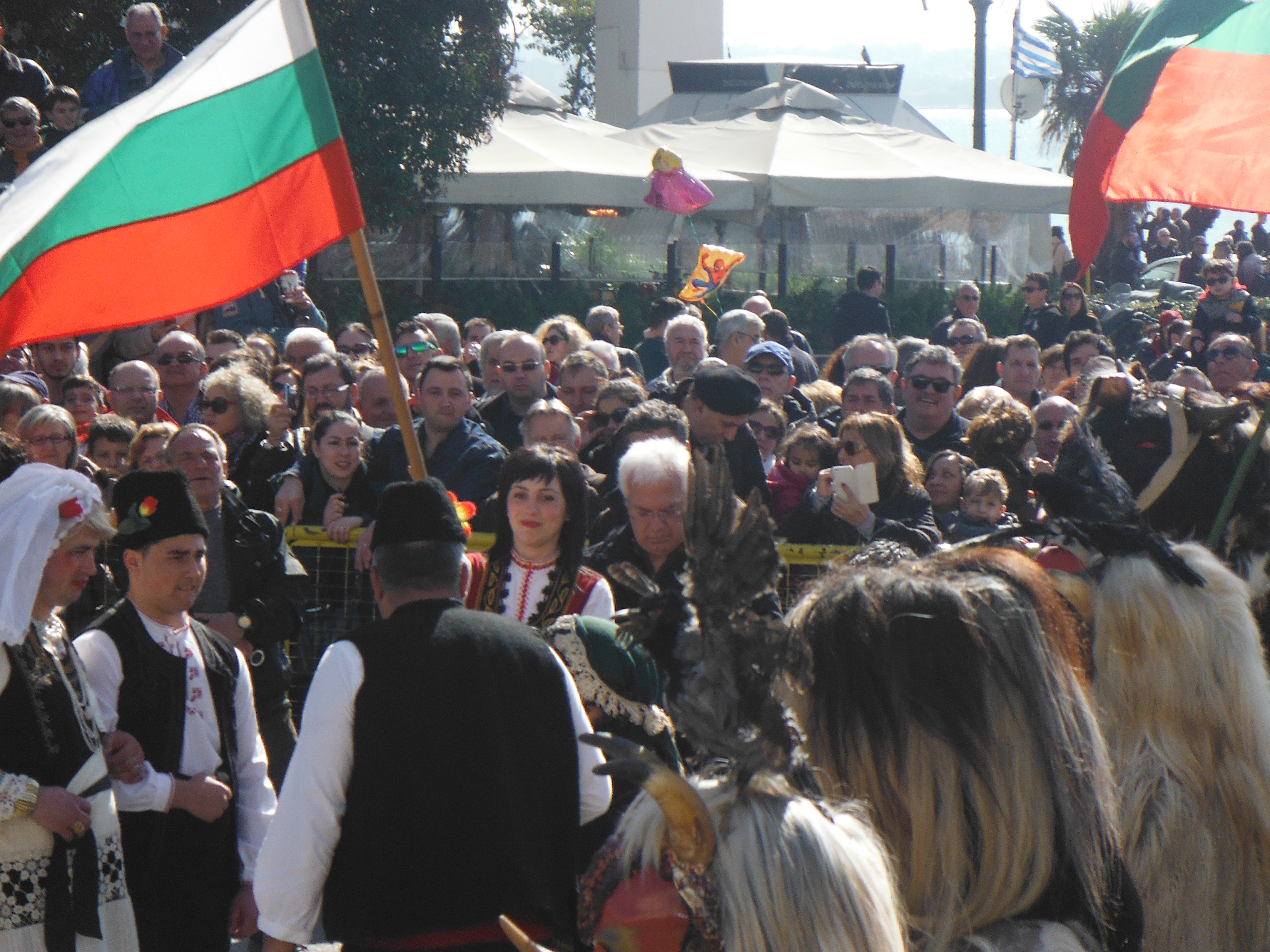 Поради такива и други подобни причини, отдавна не ходя на масови празници и мероприятия, където се правят жалки опити да се възкрeсяват напудрени и захаросани традиции. Там няма дух, има евтино зрелище и кич. И понеже всяко нещо си има изключение, тази година случайно попаднах на третия европейски парад на хлопатарите в Солун, без да знам, че е имало и първи, и втори такъв. Това беше шествие на всички онези мои, отдавна забравени, плашила от детството – бабугери, кукери, таласъми, с кози-маски и хиляди закачени по тях чанове. Бяха дошли двадесет и четири внушителни групи от всичките балкански държави – Гърция, България, Сърбия, Румъния и даже от средиземноморските острови, за да демонстрират общото си желание да изгонят злото, макар и символично, от земите ни, от живота ни, от душите ни. И като писнаха онези ми ти зурли и гайди, като заудряха тъпани, дайрета и чанове, та се вдигна врява чак до небесата. Заподскачаха в чудни ритми хлопатарите. Извиха се красиви хора. Публиката и тя запя. Корабите, хвърлили котви в залива, изпратиха своя поздрав със сирените. Нямаше бири, нямаше и пиянски тълпи. Имаше балканци, които се веселяха. Започна парадът на бабугерските групи. Всяка от тях, с кукерска обредност, показваше своята приказка, в чиято хилядолетна символика е въплътено човешкото познание за борбата между доброто и злото по земите на дедите ни. Вятърът развяваше знамената на участниците във фестивала. Уж европейски, пък едно липсваше – синьо на цвят, с кръг от звезди. Дали се беше скрило заедно със злото или просто го бяха забравили, не знам. Но затова пък всяка група от участниците водеше по една мечка завързана на синджир, която е олицетворение от памтивека на победеното зло. Не си мислете, че визирам някаква берлинска мечка. Опазил ме Господ! Това си бяха танцуващи мечки от резервата на Бриджит Бардо или някъде там наоколо. Мъкнеха се уморени, проскубани и нацупени.