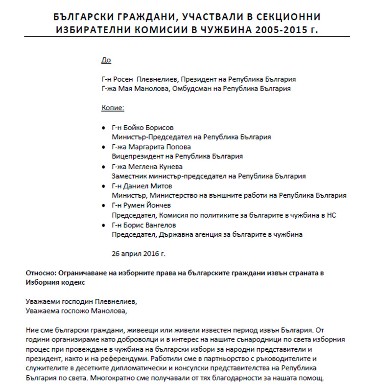 Във връзка с ограничаване на изборните права на българските граждани извън страната в Изборния кодекс, 150 български граждани, участвали в секционни избирателни комисии в чужбина в периода 2005-2015 г., изпратиха писмо до президента Росен Плевнелиев и националния омбудсман Мая Манолова. Писмото е изпратено с копие до премиера Бойко Борисов, вицепрезидента Маргарита Попова, вицепремиера Меглена Кунева, външния министър Даниел Митов, председателя на Комисията по политиките за българите в чужбина Румен Йончев, председателя на ДАБЧ Борис Вангелов.