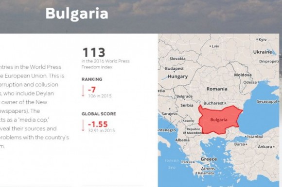 България е паднала с още 7 места в годишния индекс на медийната свобода на международната организация „Репортери без граници“ и през 2015 г. вече е на 113-то място сред 180 страни.
