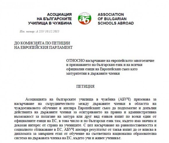 насърчаване на европейското многоезичие и признаването на българския език и на всички официални езици на Европейския съюз като матуритетни в държавите членки (вж. тук – А 213 Петиция до ЕС 2015).