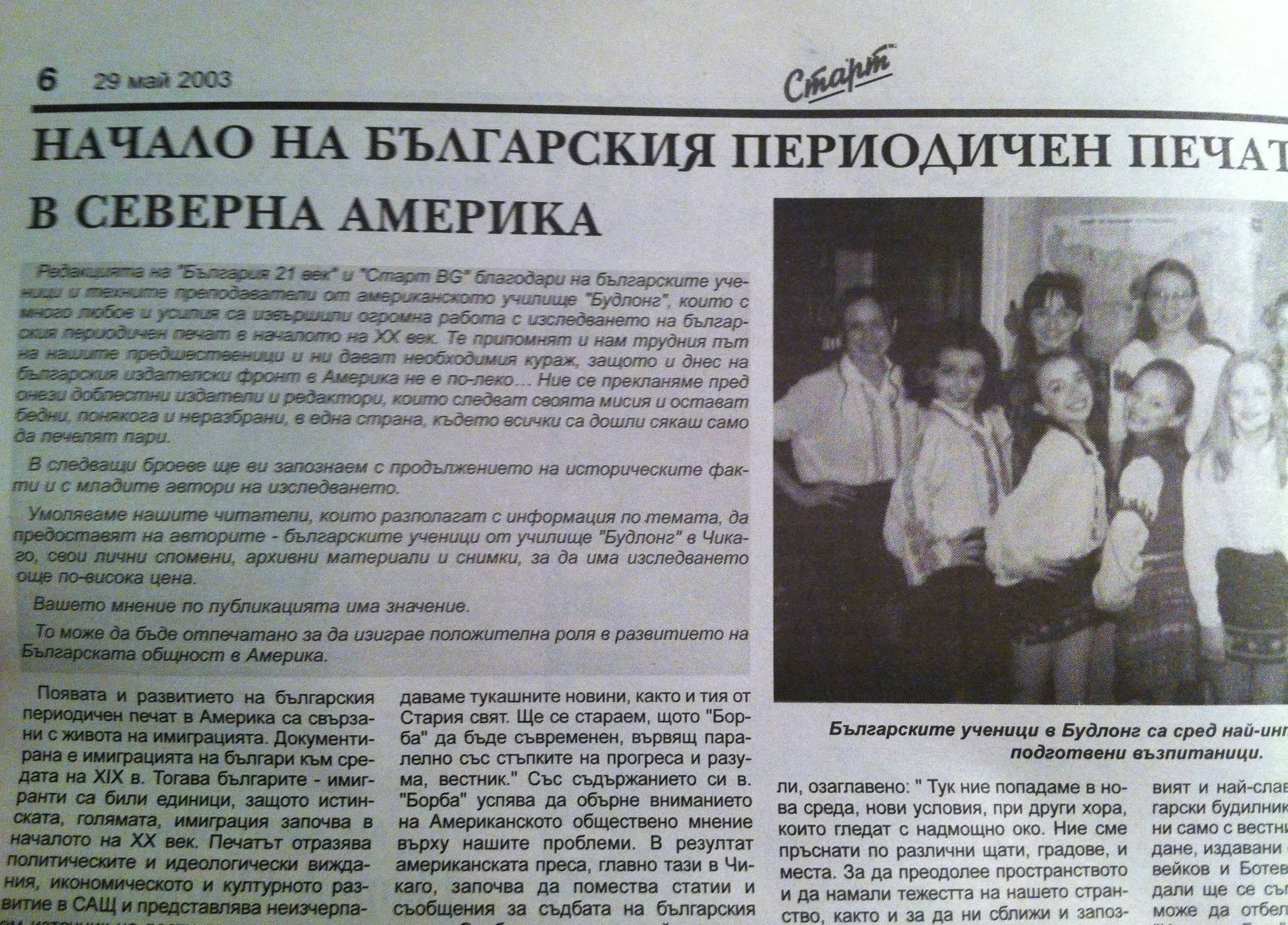 Долу: Една от най-четените статии във в. „Старт“ не само в този брой – “Начало на българския периодичен печат в Северна Америка”. Материалът е подготвен от ученичката Боряна Марчева и представлява голям интерес и за читателите на Eurochicago.com.