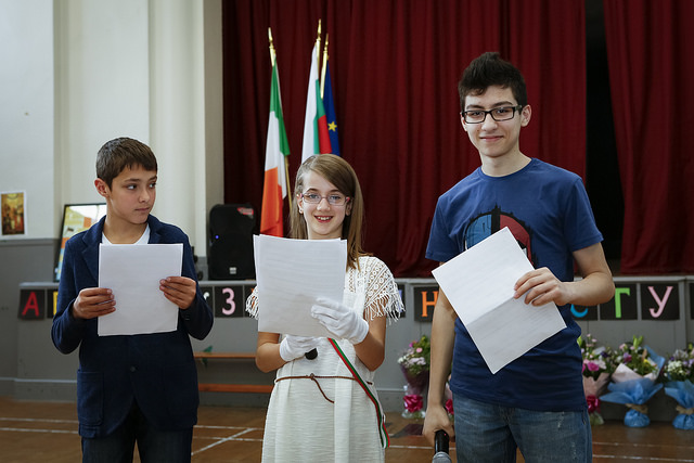 Химнът на братята Кирил и Методий отново събра всички ученици на сцената. Към тях се присъедини и развълнуваната публика, която пя заедно с децата и учителите. Бурни бяха аплодисментите за изпълнението на Кевин и Марк на стихотворението „Аз съм българче“.
