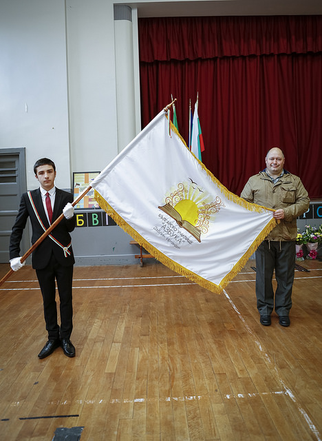 Особено сме горди днес и заради това, че нашето училище вече си има знаме, извезано в България и подарено ни от г-н Венцислав Велков и семейството му.