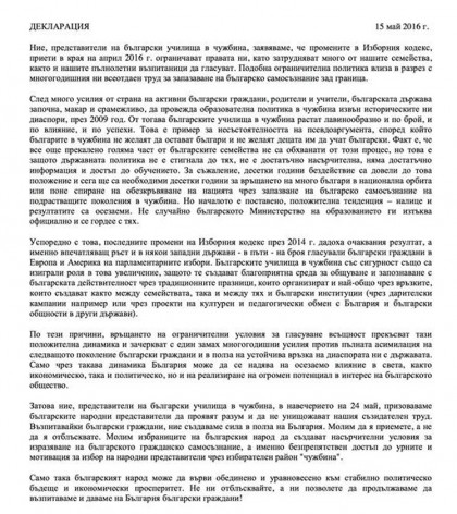 Ние, представители на български училища в чужбина, заявяваме, че промените в Изборния кодекс, приети в края на април 2016 г., ограничават правата ни, като затрудняват много от нашите семейства, както и нашите пълнолетни възпитаници да гласуват. Подобна ограничителна политика влиза в разрез с многогодишния ни всеотдаен труд за запазване на българско самосъзнание зад граница.
