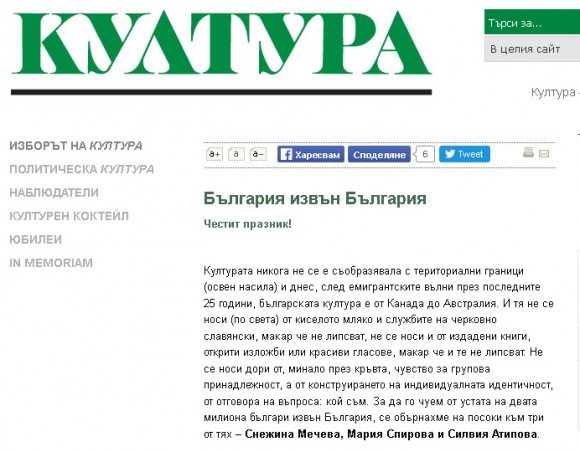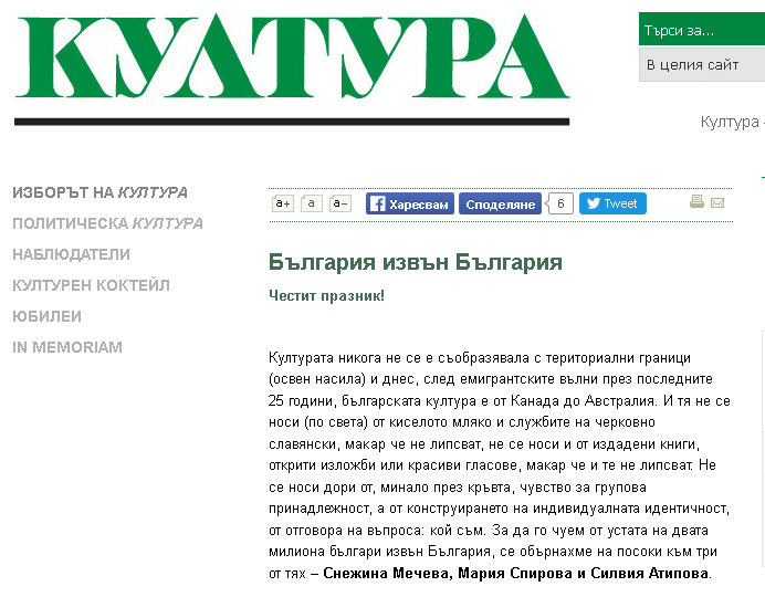 Културата никога не се е съобразявала с териториални граници (освен насила) и днес, след емигрантските вълни през последните 25 години, българската култура е от Канада до Австралия. И тя не се носи (по света) от киселото мляко и службите на черковно-славянски, макар че не липсват, не се носи и от издадени книги, открити изложби или красиви гласове, макар че и те не липсват. Не се носи дори от, минало през кръвта, чувство за групова принадлежност, а от конструирането на индивидуалната идентичност, от отговора на въпроса: кой съм. За да го чуем от устата на двата милиона българи извън България, се обърнахме на посоки към три от тях – Снежина Мечева, Мария Спирова и Силвия Атипова.