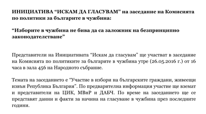 Представители на Инициативата “Искам да гласувам” ще участват в заседание на Комисията по политиките за българите в чужбина на 26.05.2016 г. от 16 часа в зала 456 на Народното събрание.
