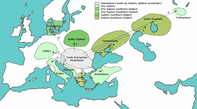 Тази карта е наречена „Арийската прародина и разселения“, която е базирана на еволюцията на индоевропейските езици.