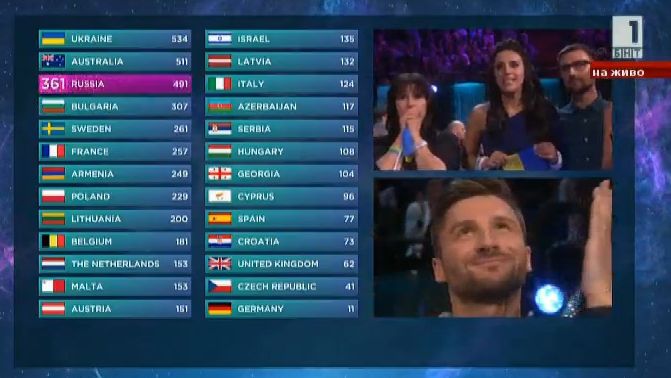 Украинското предложение „1944“ – песен, която според изпълнителката си и автор, кримската татарка Джамала разказва за депортацията на родителите й от съветска Русия през Втората световна война, триумфира над сочения за фаворит Сергей Лазарев от Русия. Той остана едва трети – след изненадващо изключително успешно второ участие за Австралия на песенния конкурс.