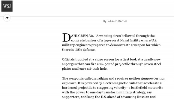 „Военните смятат, че релсотронът може да се окаже полезен, ако се наложи САЩ да защитават балтийските държави от Русия и да подкрепят съюзниците срещу Китай в Южнокитайско море“ – пише изданието. „Не бива да се пренебрегва фактът, че Русия притежава способността да произвежда и изстрелва на огромни разстояния обикновени боеприпаси с голяма маса. Ние трябва да се противопоставим на такива залпове. Релсотронът потенциално ни дава такава възможност“ – твърди пред изданието първият зам.-министър на отбраната Робърт Уърк. САЩ са започнали програмата за ER преди десет години, изразходвайки за нея до момента половин милиард долара. Сега ще бъдат похарчени още $800 млн., за да се превърне релсовото оръдие в отбранително въоръжение и да се пригодят снарядите му за палубната артилерия на американските военни кораби.